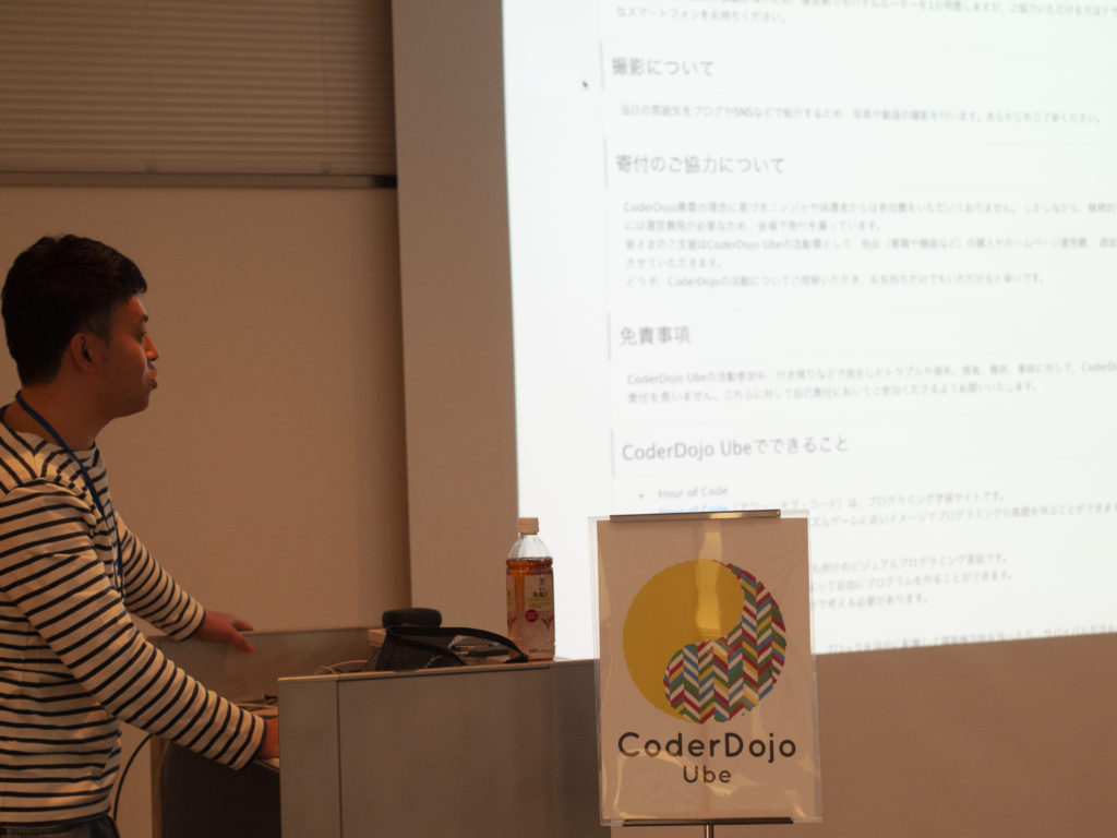 チャンピオンからCoderDojo Ubeの説明を受け、ニンジャたちはプログラミングや制作活動を楽しみました。