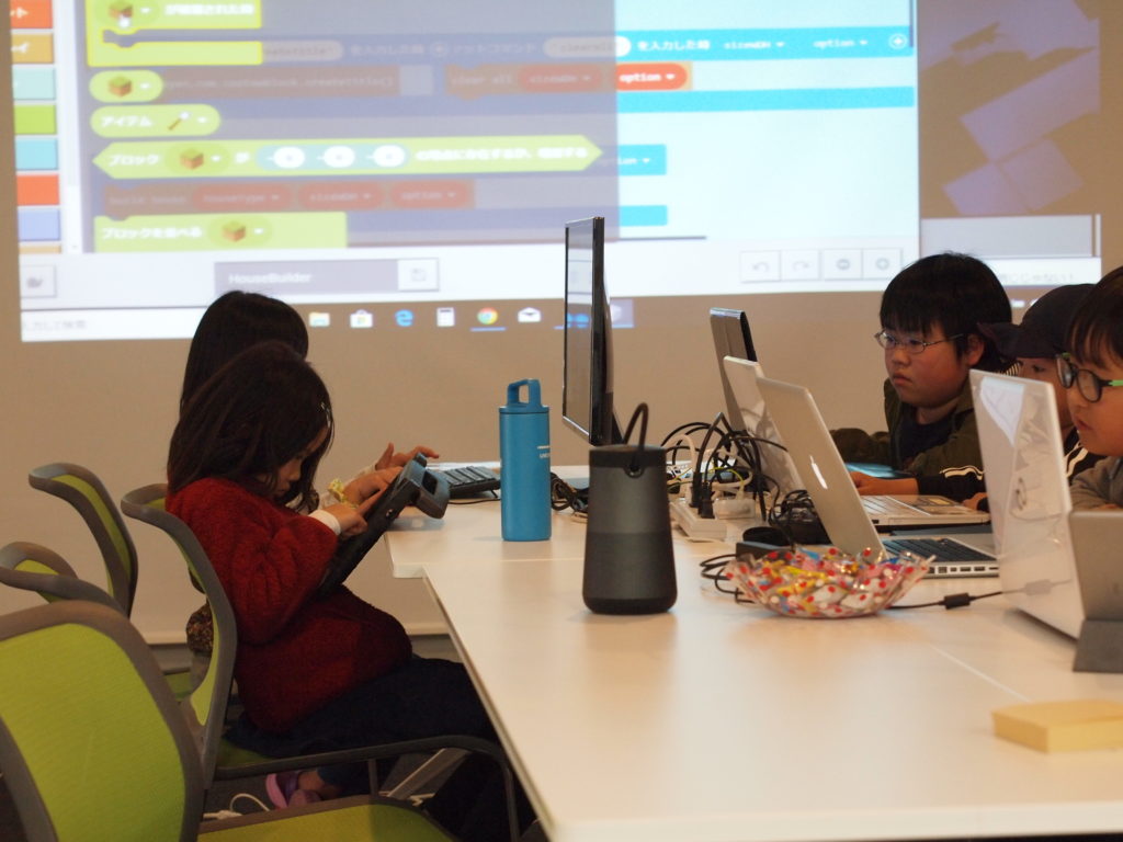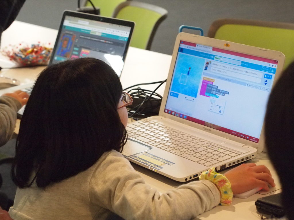 「フラッピーゲームを造る」は単純なゲームですが、自分でプログラミングしたゲームで遊ぶということをニンジャ達は楽しめたようです。その他、マインクラフトを題材にしたゲームや、アナとエルサを動かして図形を描くコードをチュートリアルを見ながらチャレンジしてくれました。