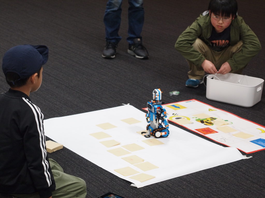 今回のLEGO BOOSTでは、まず方眼用紙に設計図を書き込み、自分で設計した内容に沿ってプログラムを組み立てるという事にチャレンジしました。
